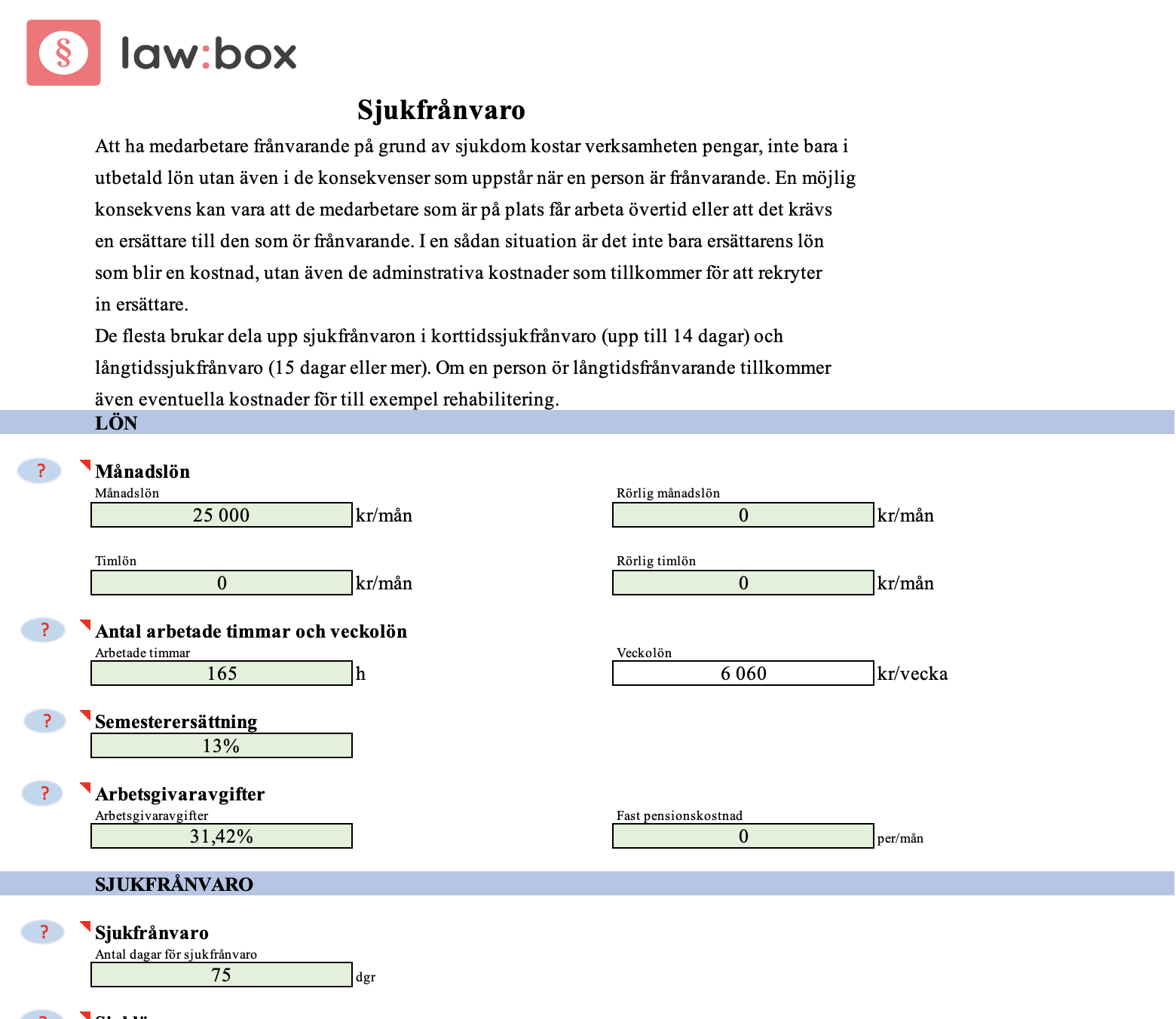 Detta är en kalkyl för sjukfrånvaro – beräkning av kostnader. Beräkningsmallen är utformad för att hjälpa arbetsgivare att kalkylera de ekonomiska konsekvenserna av sjukfrånvaro inom organisationen.