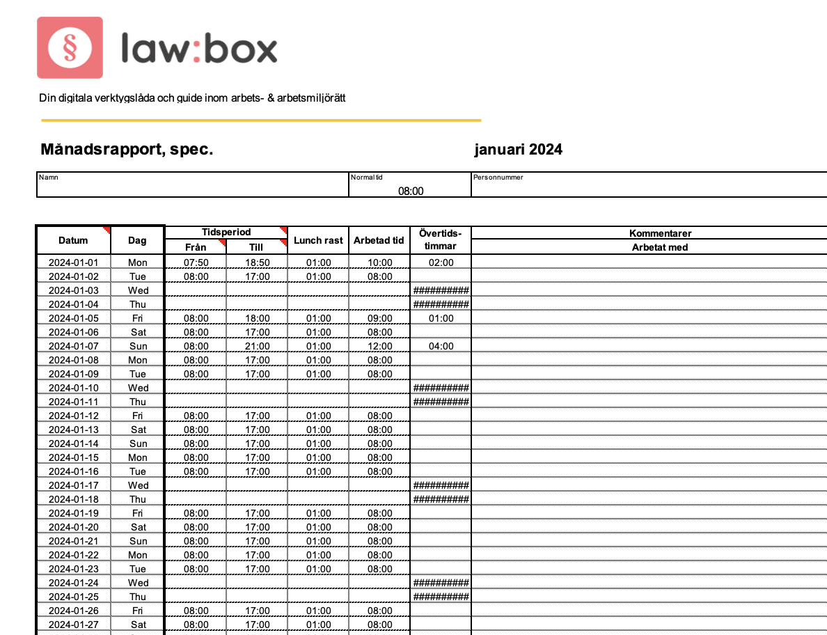 Lawbox tidrapporteringsmall är ett digitalt verktyg avsett att förenkla och effektivisera registreringen och uppföljningen av anställdas arbetstider.
